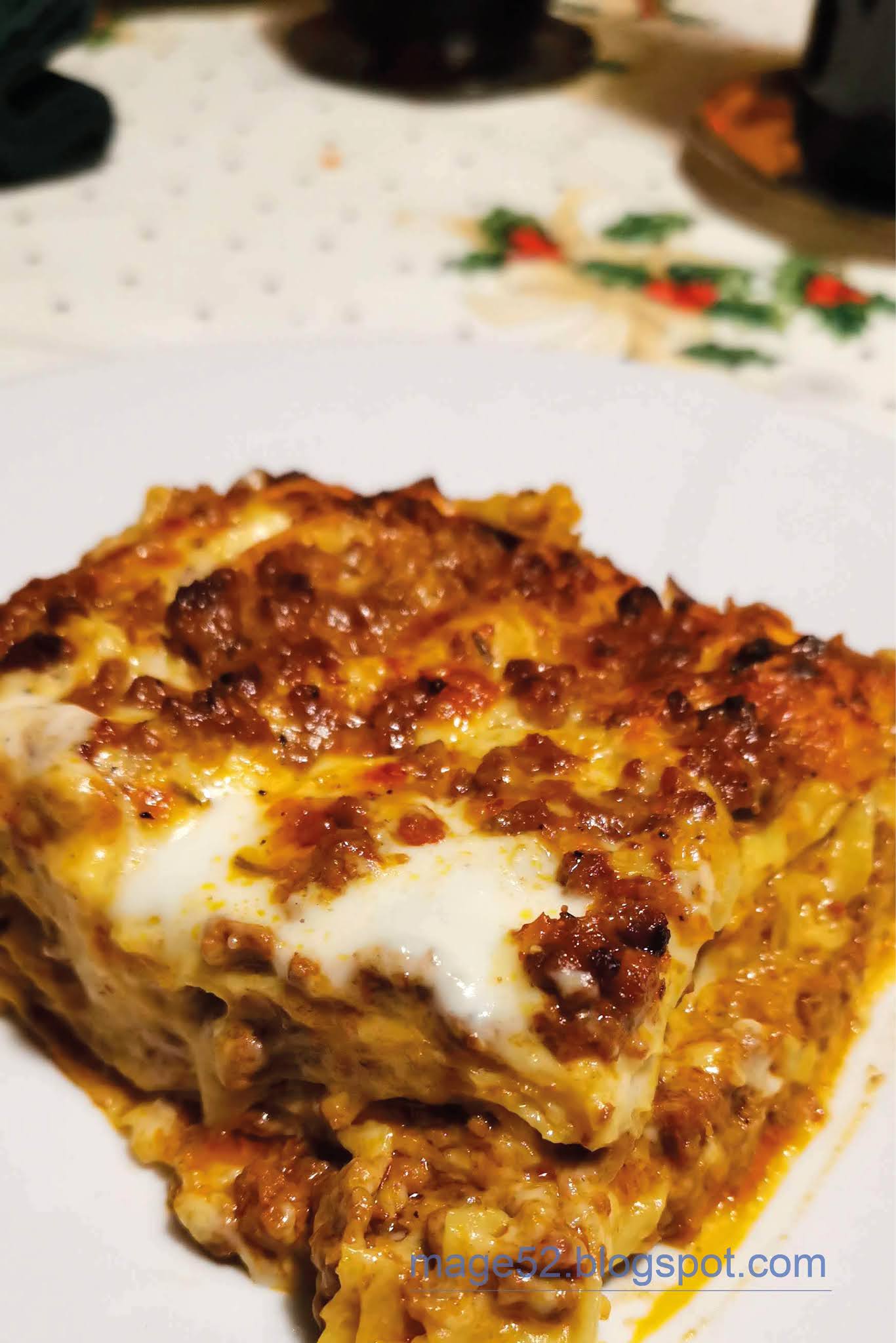 In una pirofila di cm. 30x20 versare uno strato sottile di bechamel e ragù quindi posizionare 2 sfoglie allineate, condirle con bechamel, ragù e parmigiano.